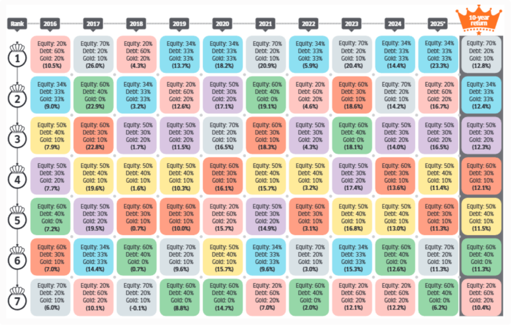 Each year had a different winner. In some years, the option with 70% equity did the best. In a few years, the mix where equity, debt, and gold were kept equal at one-third each did the best. This equal mix actually came in the top spot five times. Even the low-equity mix with only 20% equity performed very well in two years. This shows that no single combination wins every time.