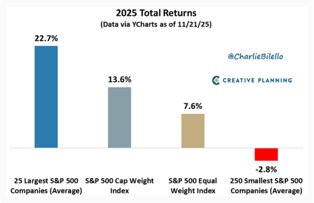 When the same S&P 500 is looked at in equal weight, the return drops to around 7.6%. And if we look at the 250 smallest companies inside the S&P 500, the return is actually negative, around –2.8%. This shows a clear gap between the biggest and the smallest companies. Large companies are pulling ahead, while smaller ones are finding it hard to perform.