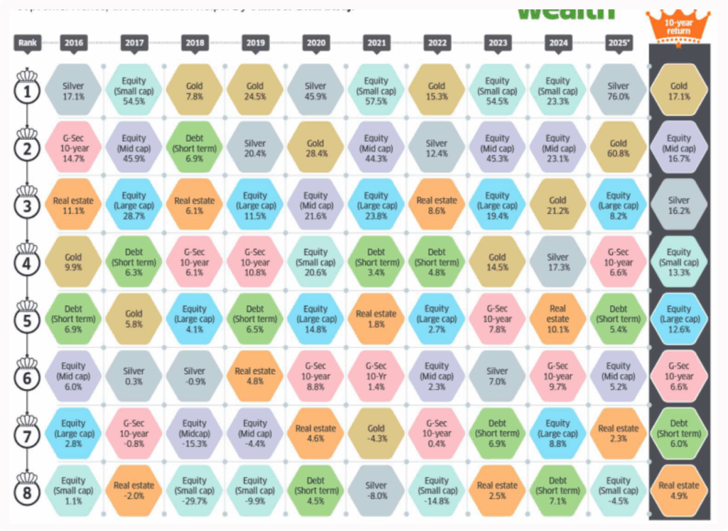 Every asset class behaves in its own way over time. When we look at the last ten years of returns, we see a very mixed picture. The data covers eight major asset classes such as silver, government securities, real estate, gold, debt (short term), equity large cap, equity mid cap, and equity small cap. Each year shows a very different result, and this pattern continues from 2016 to 2025.