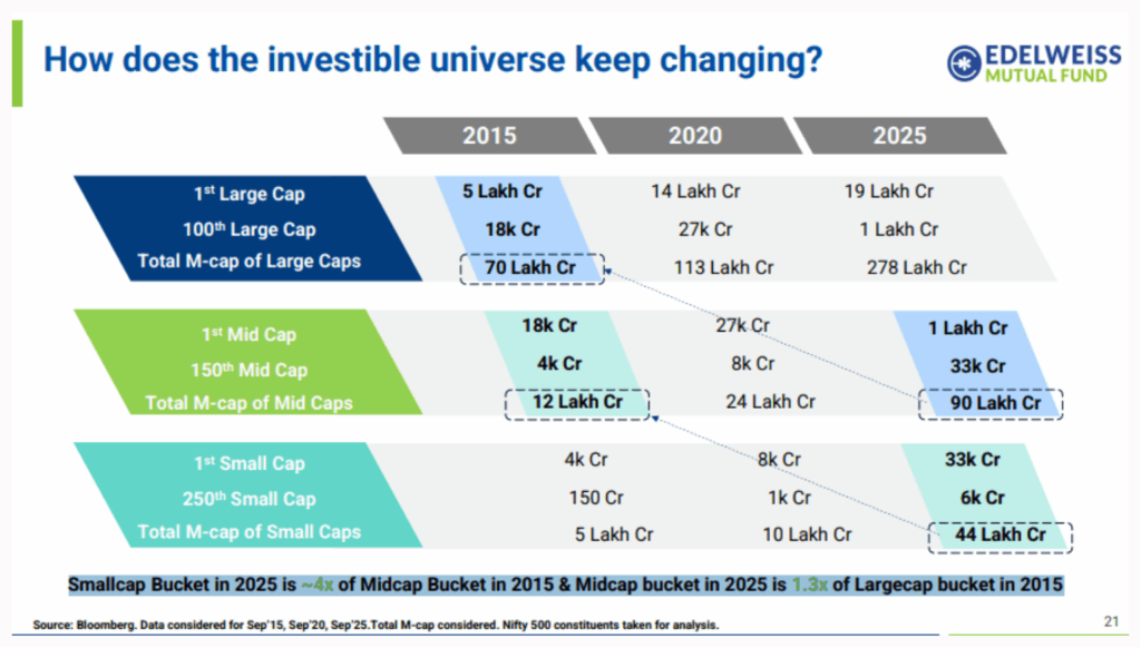 The definition of small, mid, and large-cap has changed a lot. In 2015, the smallest mid-cap company was valued at around ₹4,000 crore. Today, that same size would be called a small-cap. The smallest mid-cap now starts at about ₹33,000 crore, while small-caps in the top 250–300 list are roughly ₹6,000 crore. This shows how the market has expanded and how company values have moved to a new level.