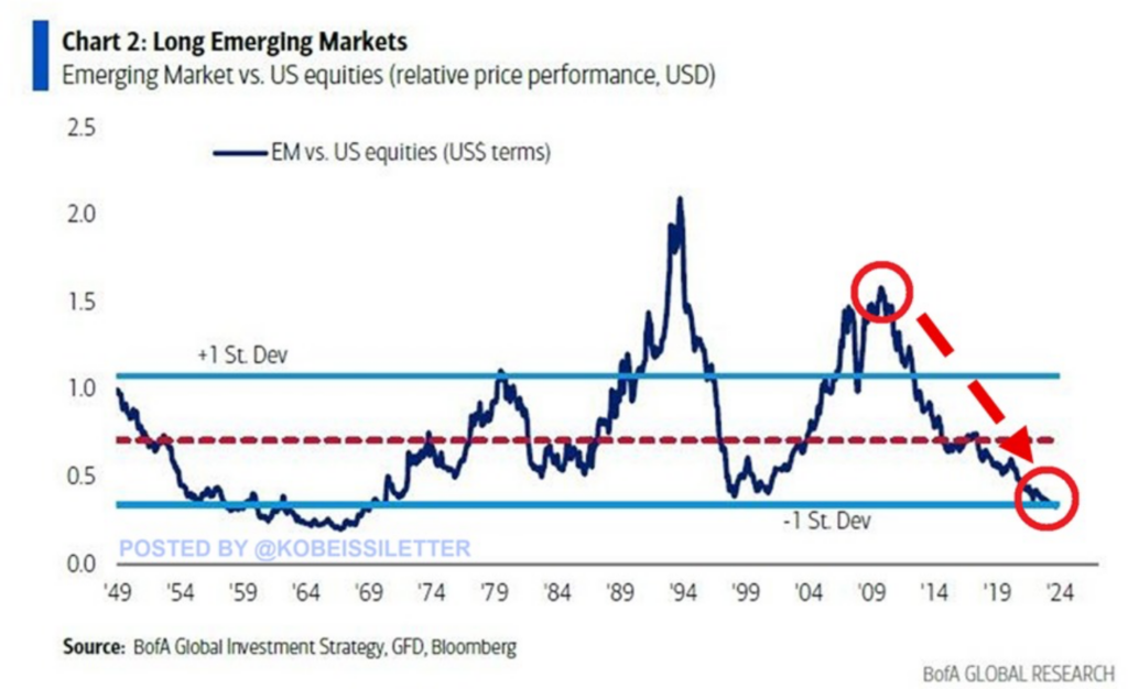 A ratio chart that compares emerging markets to the US market shows a repeating pattern. When the chart falls, the US performs better. When it rises, emerging markets lead. History shows that emerging markets have taken the lead in the 1970s, the late 1980s, and again from 2002 to 2008. These cycles take time to form, and they often last for years. Now, the chart has reached a level where major turns have happened before.