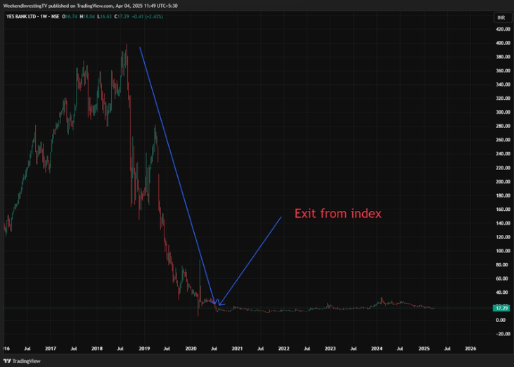 On the flip side, let’s talk about Yes Bank. Back in 2018, Yes Bank was still part of the Nifty 50 when it started crashing from ₹400. Over the next year, it collapsed to nearly ₹20, yet it continued to be part of the index. Investors who held Nifty ETFs or passive mutual funds were forced to hold this sinking ship simply because it was part of the index. The committee removed it only after most of the damage was done.