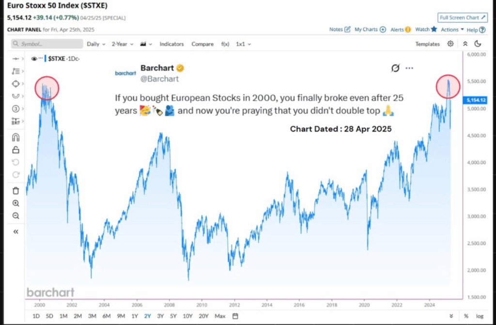 The Euro Stoxx 50 Index, one of the most popular stock indices in Europe, is currently trading near the same levels it was at in the year 2000. That means this index has not shown any real growth in the past 25 years. This is quite surprising for something as major as an index. Normally, we expect indices to grow steadily over time. But in this case, it shows how some markets can remain stuck for a long time. Right now, the chart even suggests that the index might form a ‘double top’ pattern, which could stop it from going up further.