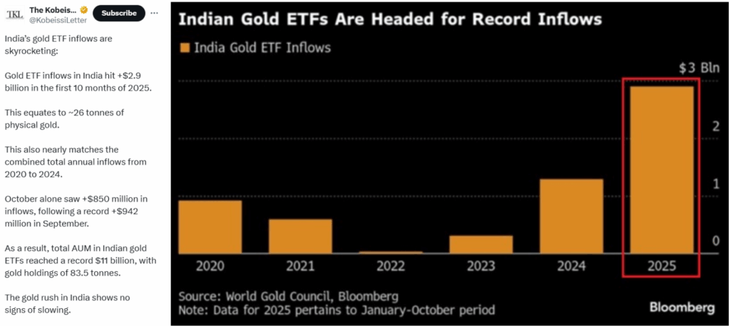 In the past year, gold ETFs in India have seen a very strong rise in inflows. Data shows that by October 2025, gold ETFs had received about 2.9 billion dollars of new money, which is equal to around 26 tons of physical gold. (see the image below)