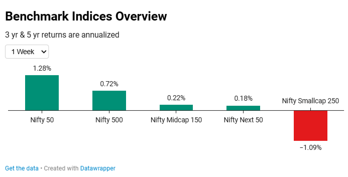 In terms of market breadth, mid-caps led the way this week with a 1.3% gain, while other indices posted more muted moves: Nifty and Nifty 500 were up 0.7%, small caps rose 0.4%, and Nifty Next 50 remained flat.