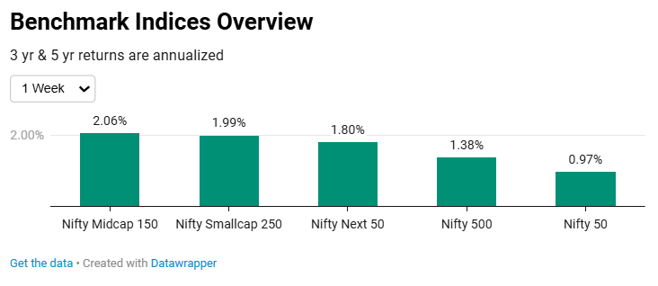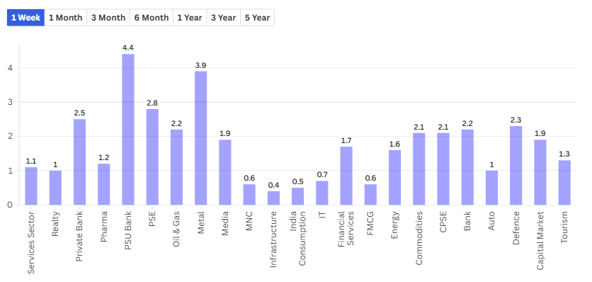 The sectoral picture was largely positive this week. PSU banks led with a gain of 4.4%, metals were up 3.9%, private banks rose 2.5%, and defense added 2.3%. Public sector enterprises also gained 2.8%. Virtually no sector ended in the red. Over longer horizons, PSU banks stand out as a consistent outperformer, along with metals and defense. Defense has delivered a staggering 60% CAGR over five years, while PSU banks and CPSEs have been equally strong. Real estate too has delivered 32% CAGR despite its recent struggles. On the flip side, oil & gas and media have been chronic underperformers, with almost negligible returns. IT too has lagged, with a modest 11% CAGR, much lower than high-growth peers. These divergences highlight the importance of sector rotation—staying with leaders when they’re performing and exiting laggards early.
