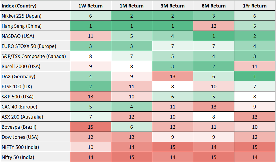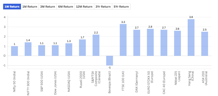 In the global indices overview—adjusted for dollar terms to allow fair comparisons—there were notable divergences. Brazil fell 1%, but markets like Hang Seng (+3.8%), FTSE (+3.3%), Canada (+2.2%), and Australia (+2.5%) posted strong gains. Nifty managed a 1.4% rise, while NASDAQ also added 1.3%. Over one month, China (via Hang Seng) has led the pack, followed by Japan’s Nikkei. On a three-month horizon, India stands out as the weakest performer compared to global peers.