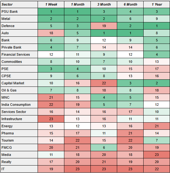 At present, PSU banks, metals, defense, and autos remain in the leadership bracket, while FMCG, media, real estate, and IT are the underperformers. This ranking underscores the need for investors to focus on strong momentum sectors rather than holding on to weak themes. Sector rotation continues to be the key to capturing market opportunities effectively.