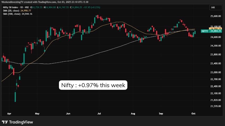 The week was shortened to four trading days, but it turned out to be an important one. After an extended stretch of weakness—nine consecutive sessions of red candles—the market finally found some relief midweek. Wednesday provided the much-needed turnaround, and Friday acted as a follow-up day, adding confidence that buyers were finally stepping in. This brief shift after persistent selling shows how oversold markets can attract support when selling pressure exhausts itself, and how even short weeks can pack in decisive moves.