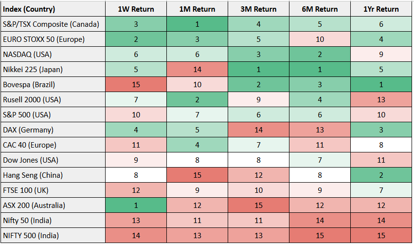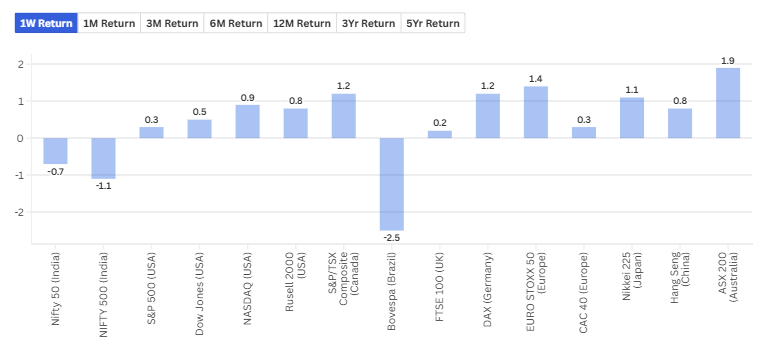 Our Global Indices Overview (in dollar terms) shows that this was a broadly positive week worldwide — except for India and Brazil, both of which ended in the red. Brazil fell 2.5%, while India slipped slightly, even as every other major market — Australia, Hong Kong, Japan, France, Germany, the U.K., Canada, and the U.S. — posted gains. This isolation underscores that the recent weakness in India is more of a localised correction, not part of a global downturn.