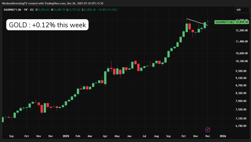 Gold was marginally up this week, by 0.12%, holding steady after recent strength. The metal’s calmness amid volatility in other asset classes suggests that investors are not yet in full “risk-off” mode.