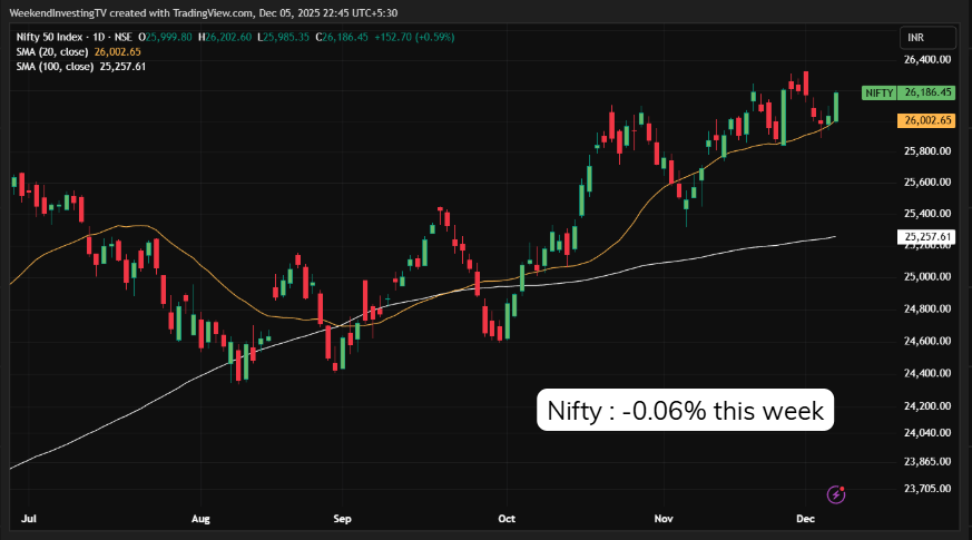 Nifty daily chart reflected this churn clearly. The first few sessions of the week saw continued weakness, but the tide turned sharply on the final trading day. Triggered by the RBI’s rate cut, the Nifty staged an impressive reversal, erasing all its earlier losses in one strong session and closing the week virtually unchanged at –0.06%.