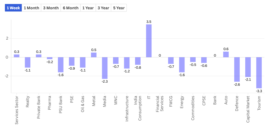 Only the IT sector managed to deliver gains, aided by the USDINR crossing the 90 mark, which boosts export earnings for tech companies. Most other sectors — defense, capital markets, tourism, media, energy, and PSU banks — saw meaningful corrections.