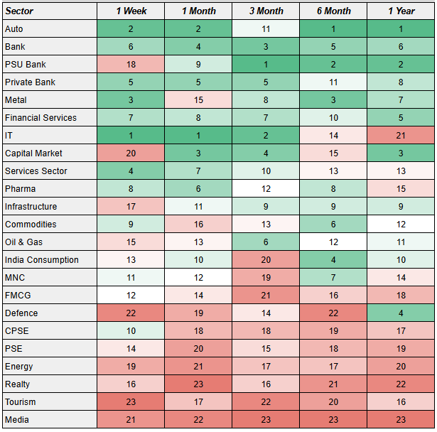 The sectoral momentum scores still place autos, banks (both PSU and private), and metals at the top — sectors that are holding trend strength. Meanwhile, media, tourism, real estate, energy, and public sector enterprises continue to occupy the bottom. A few notable shifts stood out: capital markets and PSU banks saw sharp rank drops, suggesting near-term exhaustion, while commodities and metals moved up decisively, possibly hinting at the start of another commodity-led rotation.