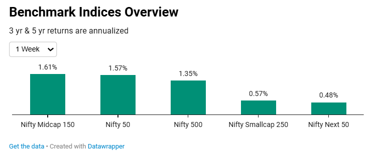 On the Indian front, the benchmark indices showed a uniformly positive week, with midcaps and Nifty50 leading, while small caps and NiftyNext50 stayed flat. Over three months, small caps still show net underperformance, but in the six-month horizon, the broader market is stabilizing.