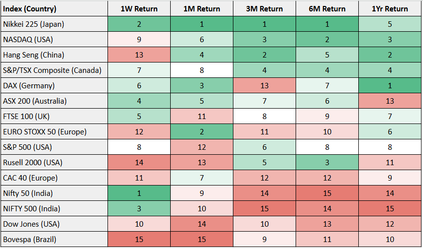 In the global momentum table, Nikkei leads, followed by Nasdaq and Hang Seng, while Canada and Nifty are climbing up from the bottom ranks. Just a month ago, Nifty was consistently sitting at rank 14 or 15—now it’s moving closer to mid-table. This early momentum shift is worth tracking closely.