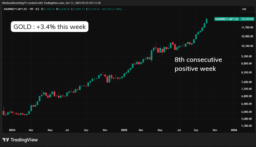 Gold once again performed as the ultimate risk-hedge, surging 3.4% this week to ₹12,514 per gram (₹1.25 lakh per 10g)—numbers that would have sounded unbelievable just two years ago. Silver too is inching into a new price regime, now trading around ₹1.6–1.7 lakh per kg, whereas it was ₹60–70k not too long ago. This is not just a price rally—it is a re-rating of hard assets.