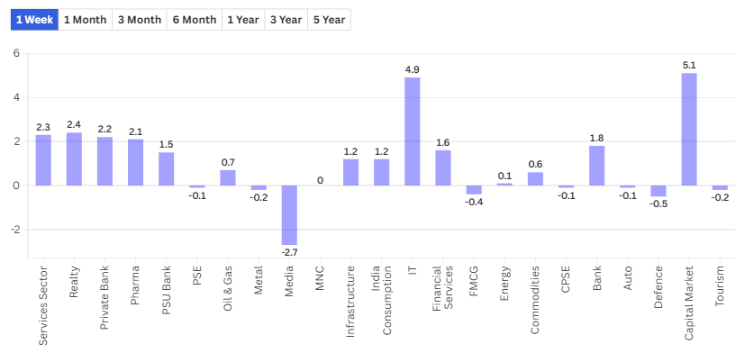 In the sectoral overview, IT stocks and capital markets staged a comeback. The buzz is that SEBI may soften its stance on weekly expiries, which revived capital market stocks. IT saw a smart rebound, possibly as panic around U.S. policy faded momentarily. These were the only two sectors that showed relative alpha.