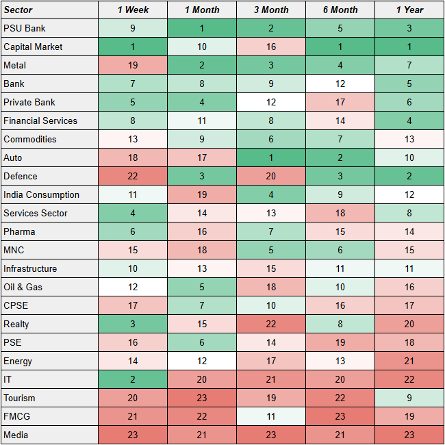 The sectoral momentum table ranks PSU banks, capital markets, metals, and private banks at the top—clear outperformance zones for short-term momentum traders. At the bottom of the list are IT (despite its bounce), tourism, FMCG, and media, with real estate starting to show signs of early recovery. Defense, which had been the star of the year, has taken a breather in the very short term, which sometimes becomes a buy-on-dip setup depending on how it behaves in the next two weeks.