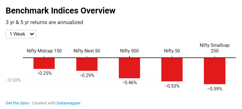 In the domestic benchmark indices, the week was uniformly weak. Most indices were down between a quarter and half a percent.