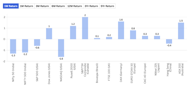 In the global indices overview (in dollar terms), Canada gained about 2%, Germany and Australia rose around 1.5%, while Nasdaq fell 1.6%. India was among the weaker performers, with Nifty 50 and Nifty 500 down roughly 1.2–1.3%, placing them near the bottom globally this week. Over the last three months, India has gone nowhere in dollar terms, while Brazil, Japan, and Europe have delivered strong gains. Over twelve months, the contrast is even sharper — Brazil up over 40%, Germany and Europe near 30%, while India remains flat to negative. Until relative performance improves, it’s understandable why global investors remain cautious on Indian equities.