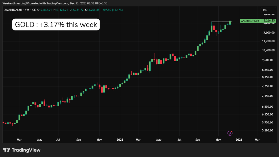 Gold had an explosive week, rising 3.17% to around ₹13,266 per gram. What many saw as a topping-out move in October has now turned into fresh highs. This reinforces a simple lesson: trying to predict the end of a strong trend is usually a losing game. The only sensible approach is to respect the trend while it lasts and step aside when it weakens. At the moment, gold remains firmly in an uptrend, aided further by the steadily weakening rupee, which keeps pushing INR gold prices higher.