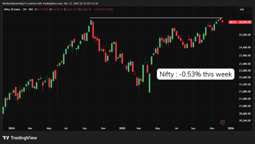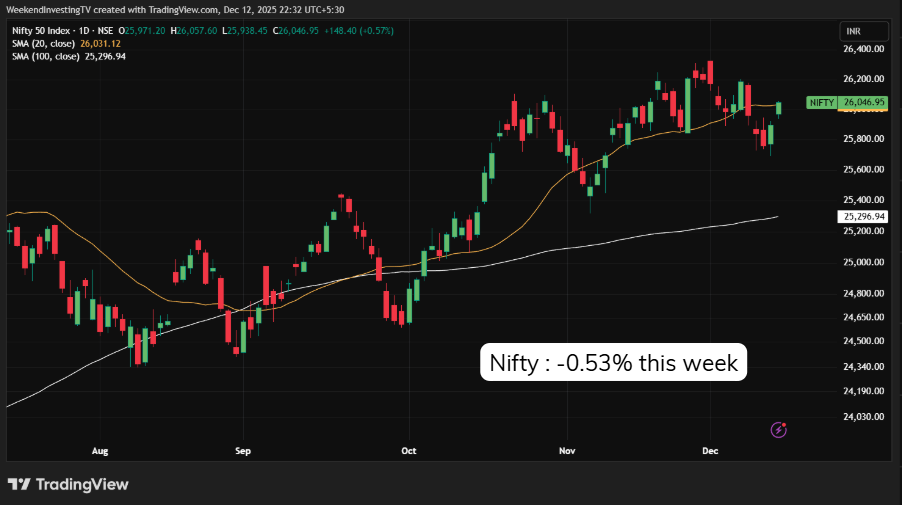 On the Nifty daily chart, the recent move down that started around the 1st of December has largely been retraced. From about 26,200, the index is now hovering near 26,046, suggesting that the market is essentially marking time rather than breaking down. As mentioned earlier, crossing the 26,000 mark repeatedly without follow-through reflects indecision, but also persistence. A weekly loss of about half a percent doesn’t change the bigger picture — it only reinforces the idea that the market is consolidating and perhaps building energy.