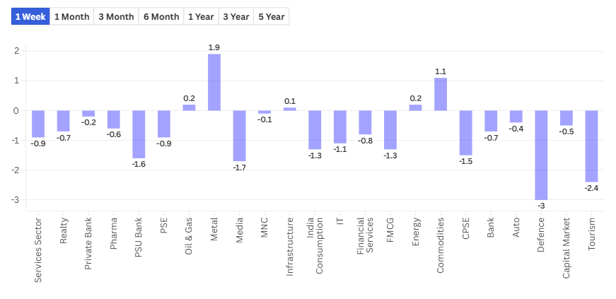 Metals and commodities were the only bright spots, with metals up about 1.9% and commodities up 1.1%. Nearly all other sectors declined — defense fell around 3%, tourism 2.4%, media 1.7%, and PSU banks about 1.6%.