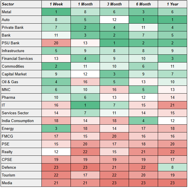 The sectoral momentum heat map shows metals, autos, and private banks still leading on a relative basis. At the bottom are defense, tourism, and media, which continue to struggle. On the positive side, energy, commodities, infrastructure, and oil & gas have begun to show short-term improvement, while PSU banks and IT stocks are losing momentum, at least for now.
