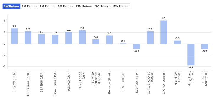 In the global indices leaderboard (converted into USD terms), Europe led with a 4.1% gain, while Hang Seng fell sharply by -3.8%. Euro Stoxx 50 gained 2.2%, while Nifty and Nifty 500 delivered 2.7% and 2.2% respectively in USD terms. Nasdaq and Russell also stayed positive while FTSE remained flat and Nikkei showed modest strength at just 0.6%. On a one-year basis, however, Nifty still shows a negative return in dollar terms, while Germany leads the global pack with a 30.5% return, followed by Nasdaq and Nikkei.