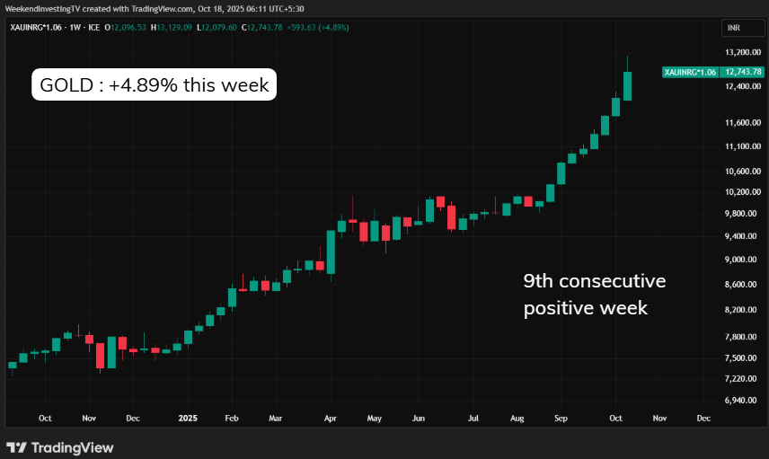 Meanwhile, gold surged another 4.89% this week, putting it into what can only be described as a parabolic phase. At ₹1,27,437 per 10 grams, the metal has risen from around ₹75,000 at the beginning of this calendar year. A 70% gain in nine months is not just a rally—it is a signal. It is telling us that fiat currencies are quietly losing credibility and real assets are being re-rated. The silent inflation hidden behind rising asset prices is becoming obvious, and the market is rewarding those positioned in tangible stores of value.
