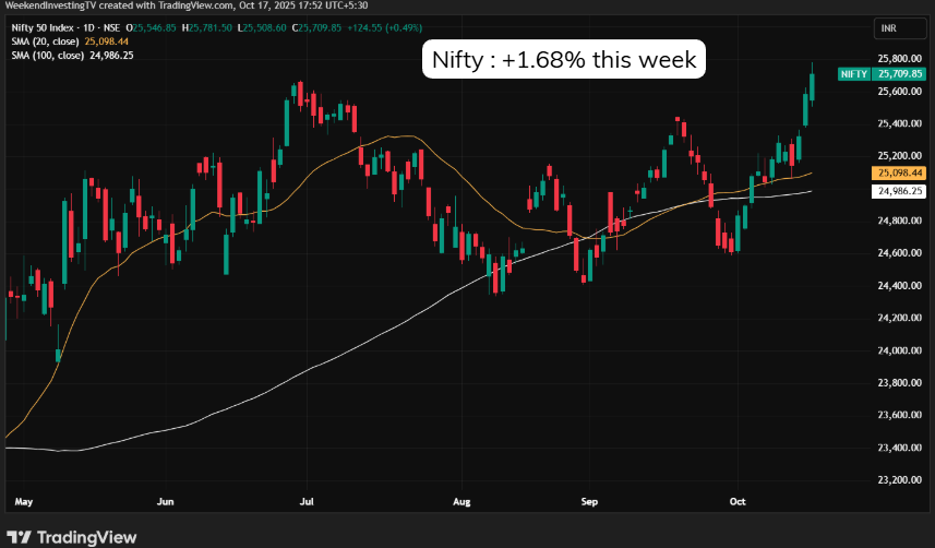 Alongside this, portfolios that had meaningful allocation to precious metals delivered standout performance, as gold and silver continued their historic surge. This is no longer just a price trend—it is part of a larger monetary phenomenon where confidence in fiat currency is visibly eroding and physical metal shortages are driving irrational price behavior. Adding to the upbeat sentiment, the result season has begun, and as of 18th October, reliance results look strong and may support market sentiment further as we step into the next trading week.