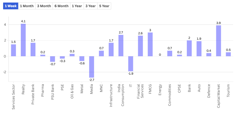 Sector-wise, real estate led with a strong 4% rally, followed by capital market stocks which bounced back on news that SEBI may not go ahead with banning weekly expiries. FMCG showed renewed strength following optimistic Nestle earnings, easing fears around demand slowdown. Financial services and consumption-oriented stocks gained, while IT (-1.9%) and media (-2.7%) lagged behind, showing that rotation is still very much active.