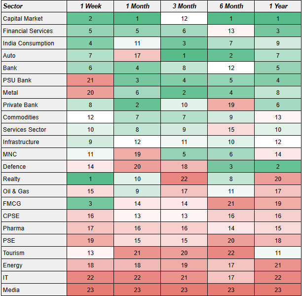 In the sectoral momentum scorecard, capital markets, financial services and consumption themes occupy the top ranks, while autos are showing signs of cooling off after a strong stretch. PSU banks and metals have dropped in ranking, while real estate and FMCG are climbing rapidly. Meanwhile, IT, pharma and energy continue to underperform, sitting consistently in the bottom quartile.