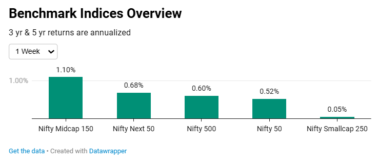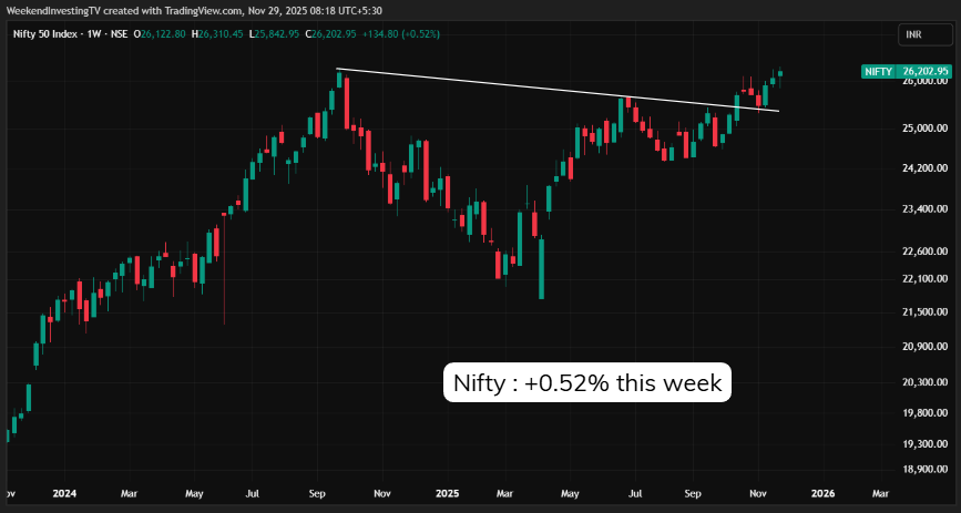 Looking at the daily Nifty chart, the week had one strong, decisive session midweek surrounded by four sluggish ones. Still, that one move was enough to push the Nifty to a fresh weekly close, ending up 0.5% for the week.