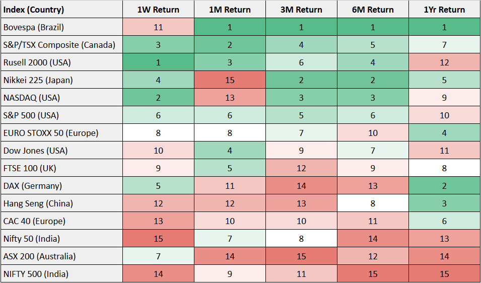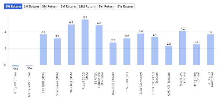 In the Global Indices Overview (in dollar terms) — Russell 2000 led with a 5.5% weekly gain, followed by NASDAQ, Dow, and S&P 500, all up between 3.5–4.5%. Japan’s Nikkei added 4%, impressively so given that its currency weakened at the same time — meaning foreign investors made even more in local terms. Germany rose 3.8%, while Brazil continues to dominate the 12-month leaderboard with a 42% dollar return, followed by Hang Seng (+33%) and Germany (+33%). India, by contrast, has been flat in dollar terms this year — respectable but not exceptional. Over five years, however, India remains among the steady outperformers, while China and Australia continue to lag.