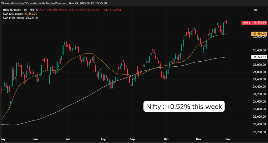 The weekly chart paints a clearer story. After retesting its trendline three weeks ago, the market has climbed steadily to around 26,200, holding above key supports. The trend remains up, but the enthusiasm seems muted — there’s no “urgency” or strong momentum behind the move. The structure is sound, but the energy beneath it feels like cautious optimism rather than full-blown bullishness.