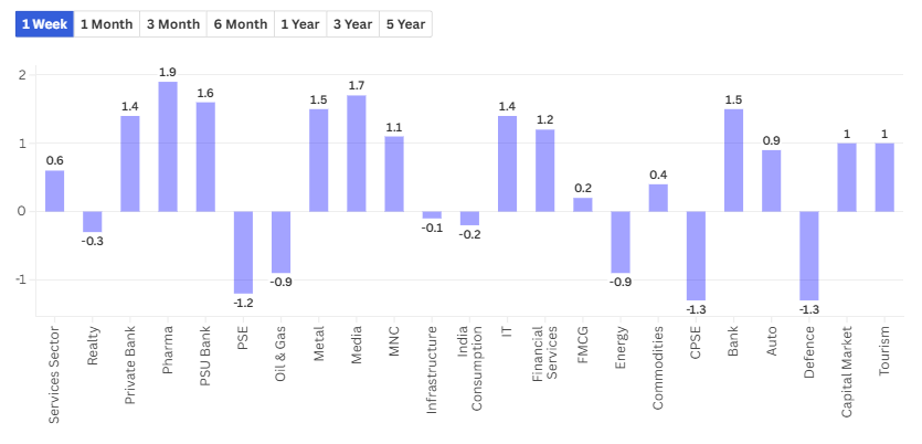 At a sectoral level, pharma stocks led with strong gains, reclaiming leadership after weeks of underperformance. Media (+1.7%), banks (+1.5%), and metals (+1.5%) followed, with PSU banks (+1.6%) and private banks (+1.4%) also contributing. On the losing side, CPSEs, oil & gas, energy, and defense slipped, showing fatigue in government-linked and energy-heavy spaces. Over the past year, capital markets (+28%), PSU banks, autos (+20%), financials, and metals have been the strongest performers. On the flip side, IT (-13%) and real estate have struggled, though the latter still boasts solid multi-year returns — +26% in 3 years, +28% in 5 years. The undisputed star, however, remains defense, up 59% CAGR over 5 years — a testament to consistent order flows and policy support.