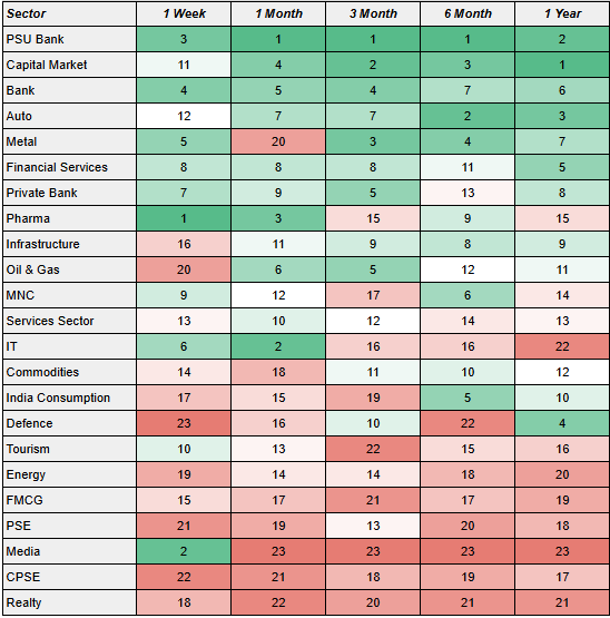 The sectoral heatmap for momentum continues to crown PSU banks and capital market stocks as the top spaces, alongside autos and metals. These sectors show sustained upward continuity — the kind of trend-following behavior investors love. At the bottom lie public-sector enterprises, realty, FMCG, energy, and media. Interestingly, pharma is beginning to show green shoots, while media has shown a short burst of momentum that might not last. The recent dip in oil & gas and defense could just be consolidation after long rallies.
