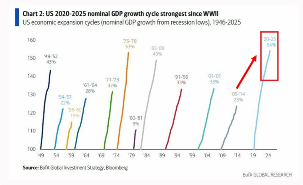 When we compare different five-year periods of US economic history, none of them show such a strong jump in nominal GDP. This period has beaten every other stretch of growth since World War II. The number itself tells us that even with all the worries and talks of slowdown, the economy has managed to push forward strongly.