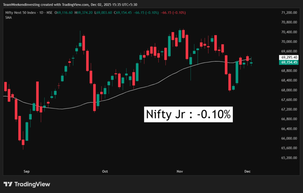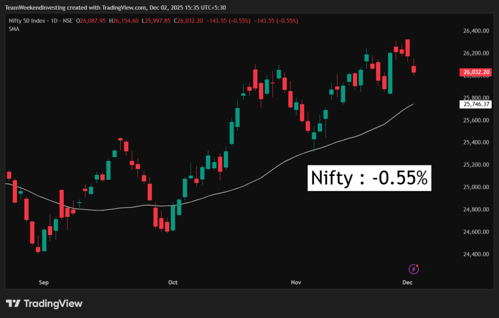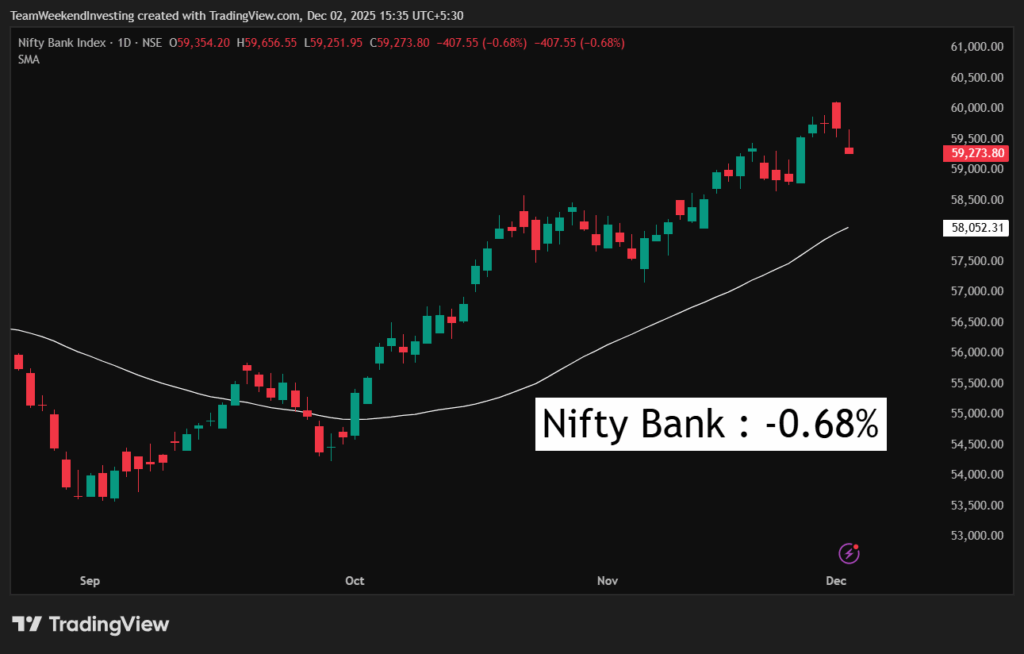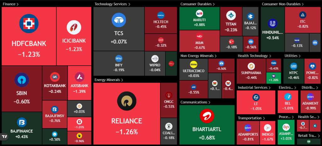 The Nifty heat map was predominantly red, with HDFC Bank, ICICI Bank, Axis Bank, Kotak, and SBI all losing ground. Reliance lost 1.26%, and ITC lost 0.8%. Power Grid, BEL, L&T, and Indigo, which were recent gainers, also saw losses today.