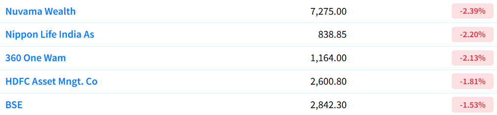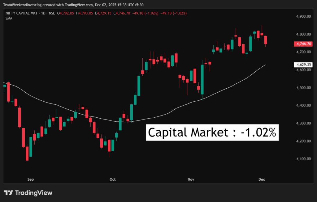 Within the capital market space, Nuvama, Nippon Life, 360 One Wam, HDFC Asset, and BSE all lost some ground, with the index down 1.02%.