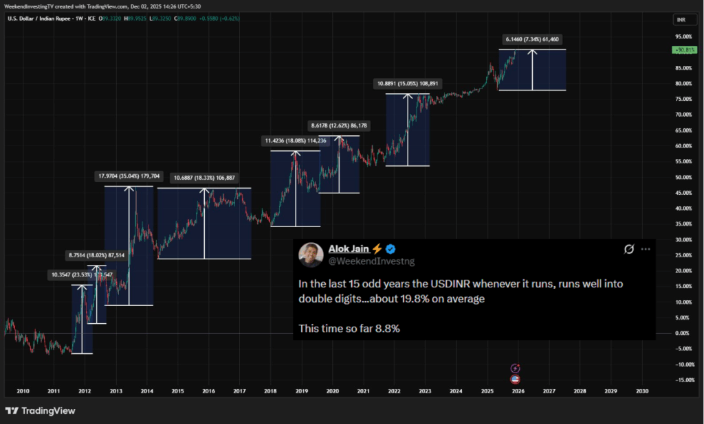 Regarding the USD/INR picture, If you look at the tweet, it shows the USD/INR chart over the last two decades. Historically, every sharp move in the USD/INR averages out to be about 19.8%. The pattern involves stagnation, then a sharp move up, then stagnation, consolidation, and another move up, and so on. This current move so far is about 8.8%.