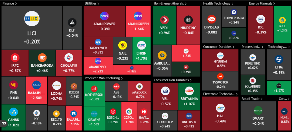 Bharti Airtel, Maruti, Dr. Reddy’s, Asian Paints, NTPC, and Hindustan Unilever were some of the small gainers in the Nifty Next 50 heat map. However, some PSU banks like Bank of Baroda and Canara Bank were still doing well. Bajaj Holdings and Bajaj Housing saw significant sell-offs today. Adani & Co, Adani Green, CG Power, Mazdock, Indian Hotels, IOC, and Hindustan Zinc were all coming off. JSW Steel, Vedanta, Enrin, Motherson, Siemens, Bosch, Britannia, Naukri, BPCL, and Canara Bank were among the stocks moving up.