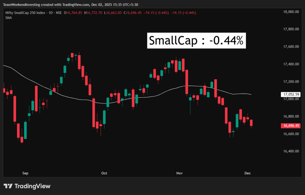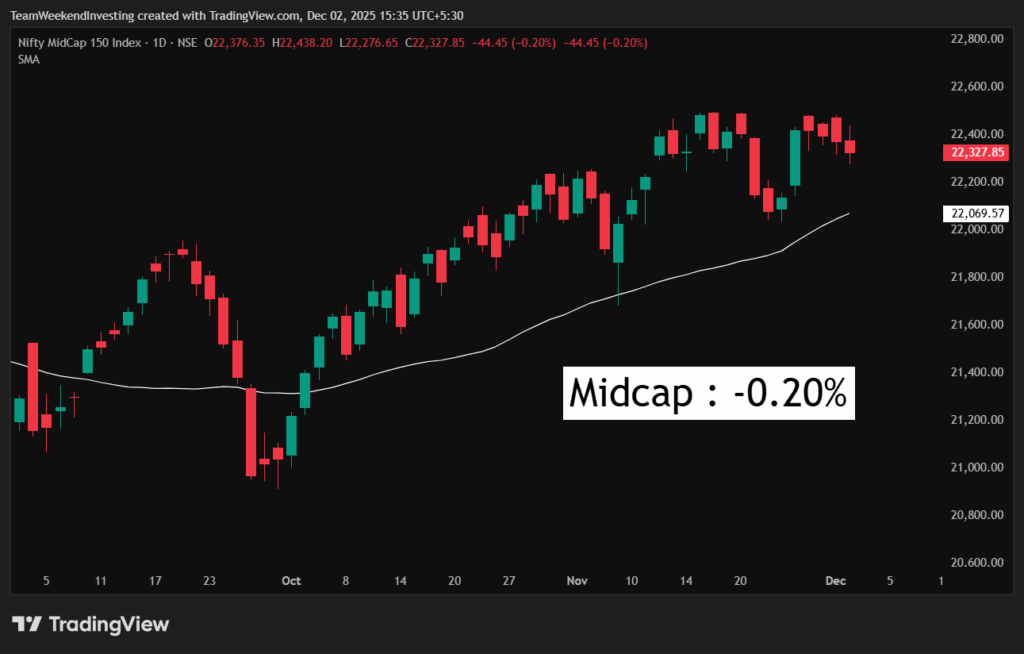 However, Nifty Junior is still holding up, down only 0.1% today, and Midcaps were mildly down by 0.2%. Small caps were down 0.44% and are not looking too healthy despite the larger-cap segments of the market moving up; small caps have not followed the leading parts of the market.