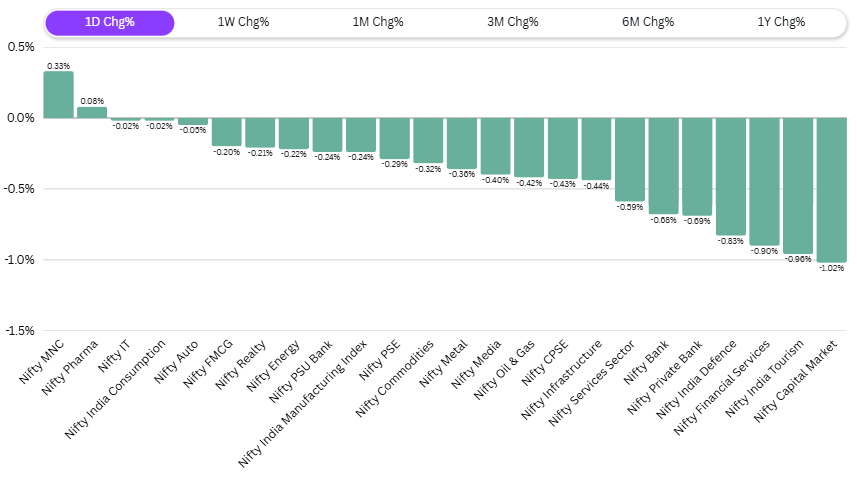 In terms of sectoral trends, almost all were down, with Capital Market and Tourism stocks both losing 1%. Nifty Financial Services, Defense stocks, and Private Banks lost between 0.8% and 0.9%, and the overall Banking space was down 0.7%. Only minor gains were seen in Nifty Pharma and Nifty MNC. Looking at the last one month, Capital Market stocks have gone up nearly 5%, while Real Estate stocks have gone down by about 6%. Media is down 5%. PSU Banks and Nifty IT are also up, at about 5% and 4% to 5% respectively. So, the last month has been a mixed bag. Over the last one year, Capital Market stocks and PSU Banks have been the leaders with around 24% to 25% gains, while Media stocks are down 27%. Real Estate and IT are also down 14% to 15%. These have been the major movers over the last year.