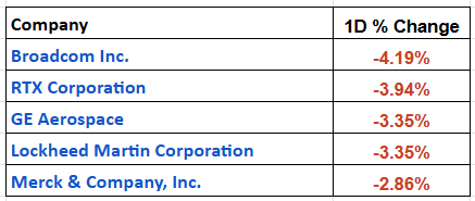 US markets in the previous session also lost some ground, with the S&P, Dow Jones, Nasdaq, and Russell indexes down between 0.4% and 1.2%. Among individual stocks, Broadcom lost 4%, RTX Corp nearly 4%, and GE Aerospace, Lockheed Martin, and Merck & Co. lost between 2% and 4%. Broadcom has seen a significant run recently, so this is a mild correction. Some of these stocks are part of the Weekend Investing U.S. stock strategy, and this is certainly not a recommendation.