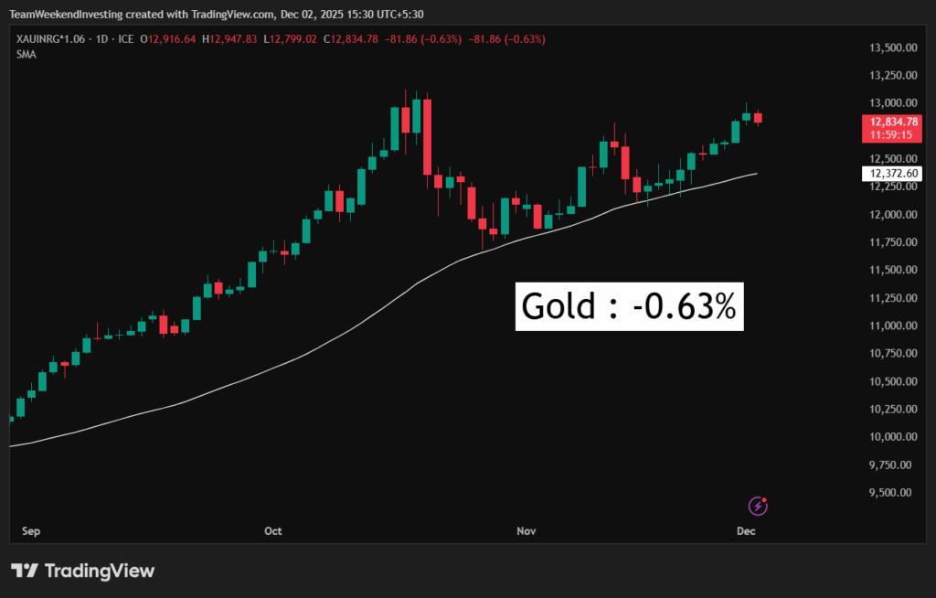 Gold also looked a bit tired after its recent 7 to 8-day run, down 0.63% to 12834.