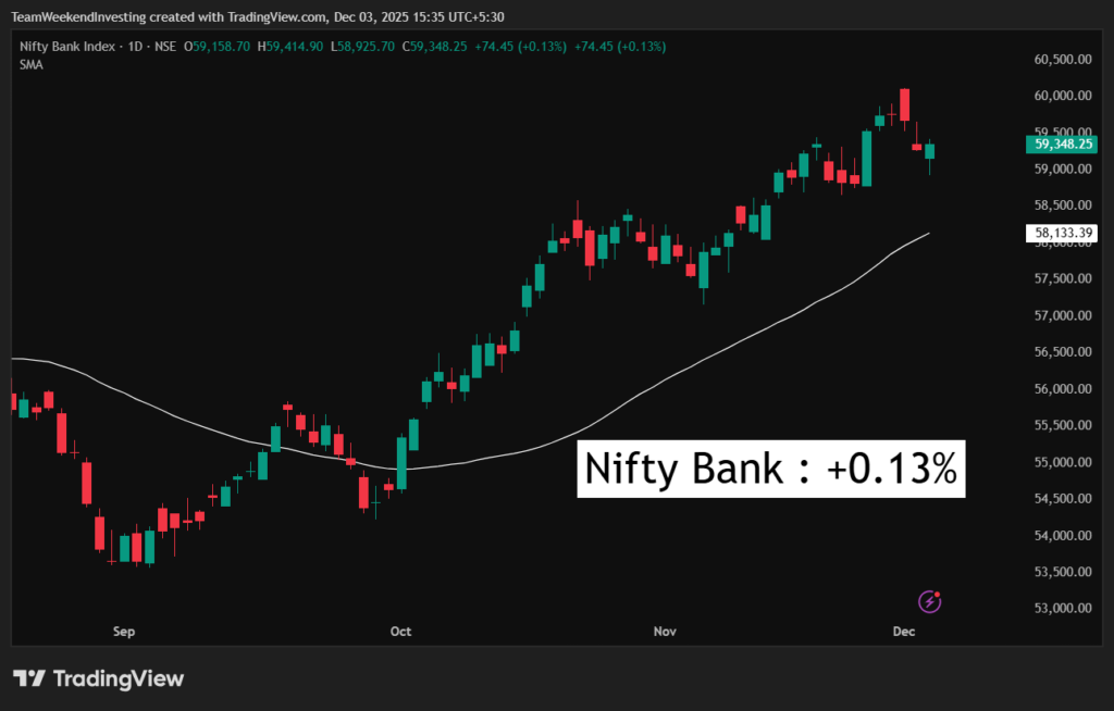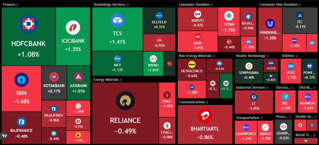 The Nifty heatmap showed very specific areas of green. IT stocks such as Infosys, TCS, Wipro, and HCL Tech were in the green. In the banking space, private banks were up while PSU banks were hit hard. SBI was down 1.68%, whereas HDFC, ICICI, Axis, and Kotak Bank were up. The rest of the market was generally down.