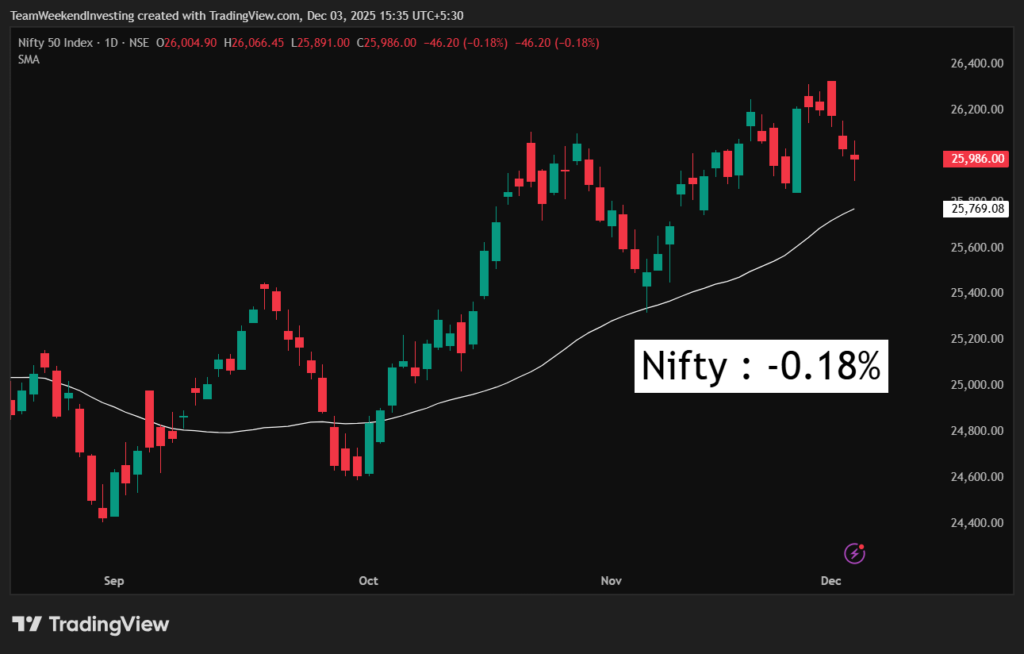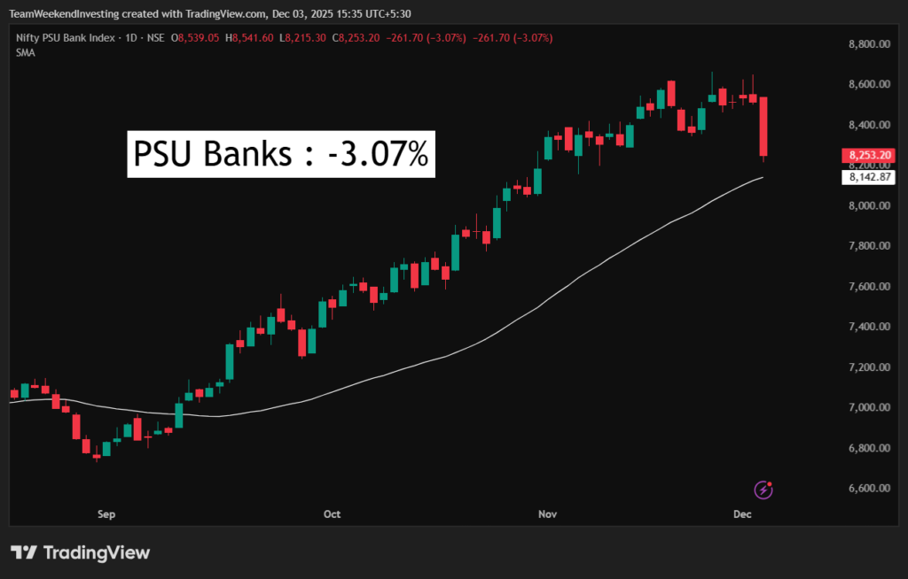 Sectoral trends were dominated by losses. Nifty PSU Bank was down 3%. This is a significant move for a sector that had been leading, with its one-year gain now reduced to 18%. The pressure on PSU banks comes after the rumor about allowing FDI up to 50% was denied, which has caused the segment’s performance to flatten over the last month. Defense stocks and Capital Market stocks were also down 1.8%.